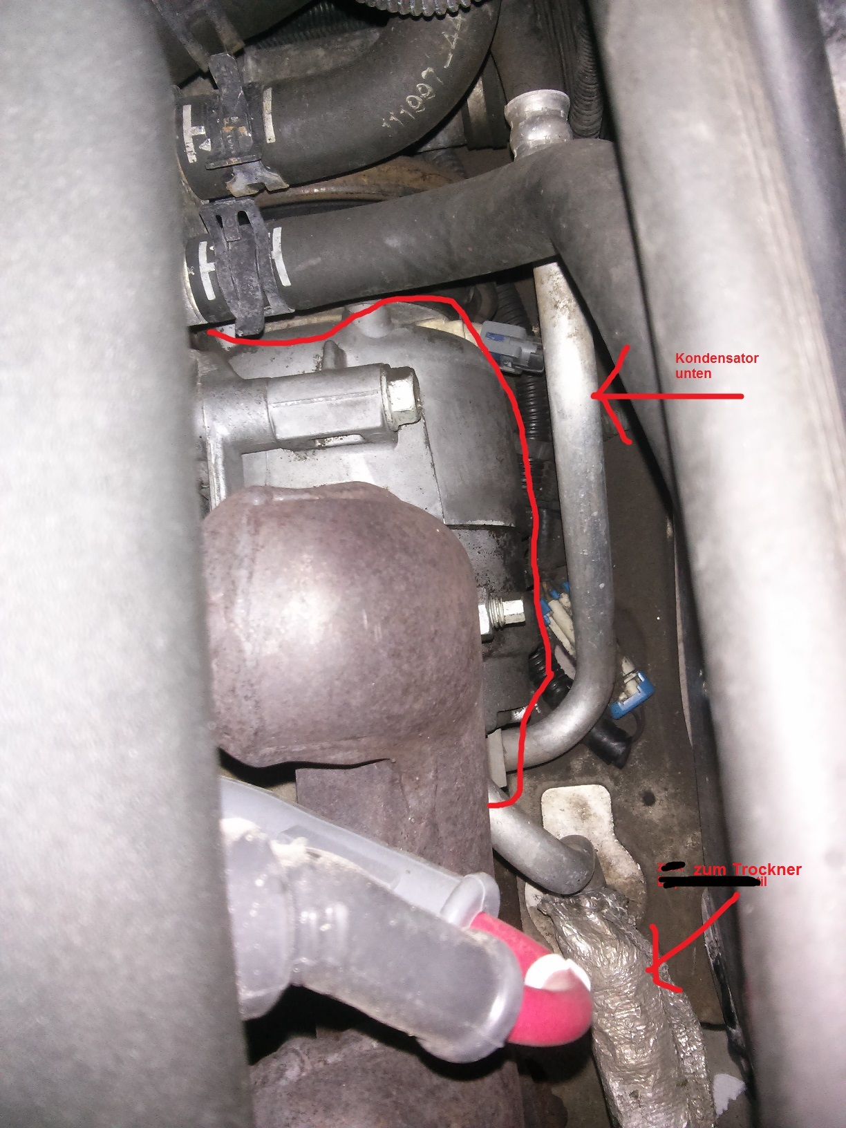 Der Kompressor sitzt beschissen unten am Motor, unter Krümmer und der Wapu. Leitungen zum Kondensator unten und zum Trockner. Krümmer oder Wapu werden raus müssen.