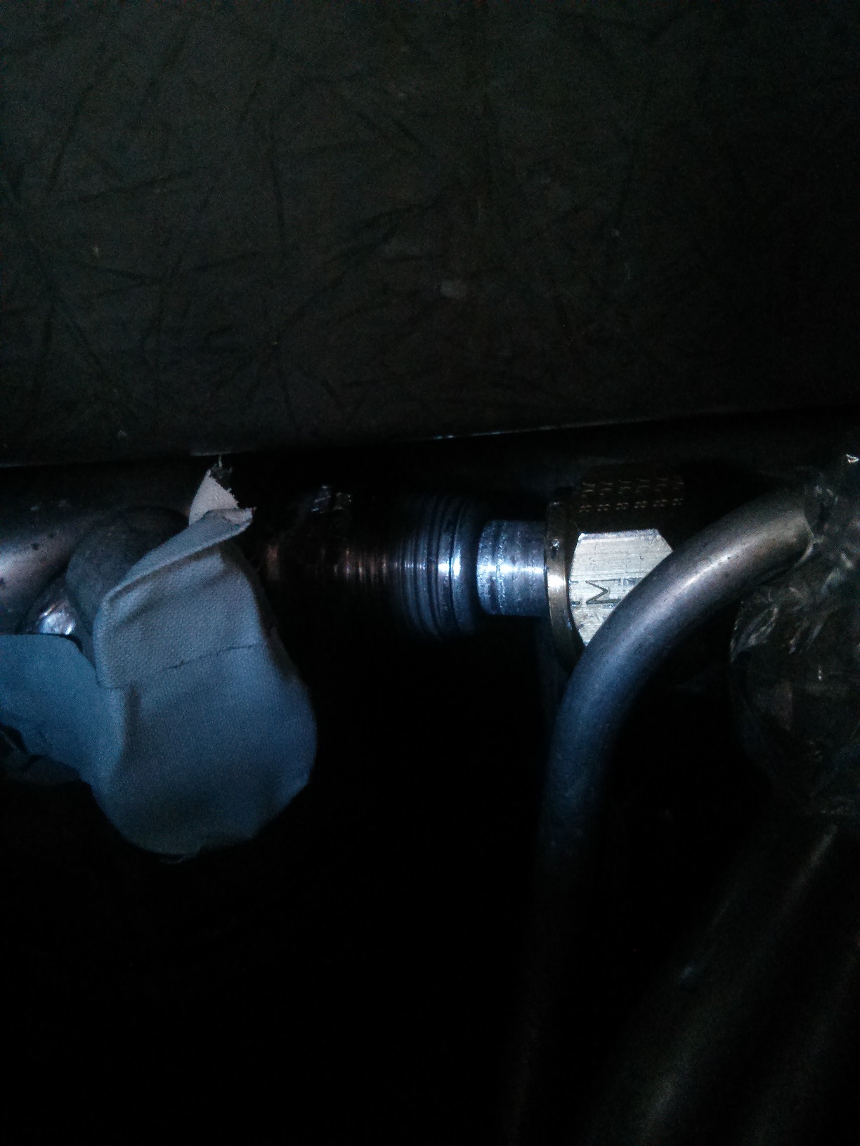Hier die verf*ckte Befestigung. Kommt man nur mit nem Gelenk dran. Dann erstmal Pause, weil ich noch passende Maulschlüssel für die schei** Riesenmutter brauche.