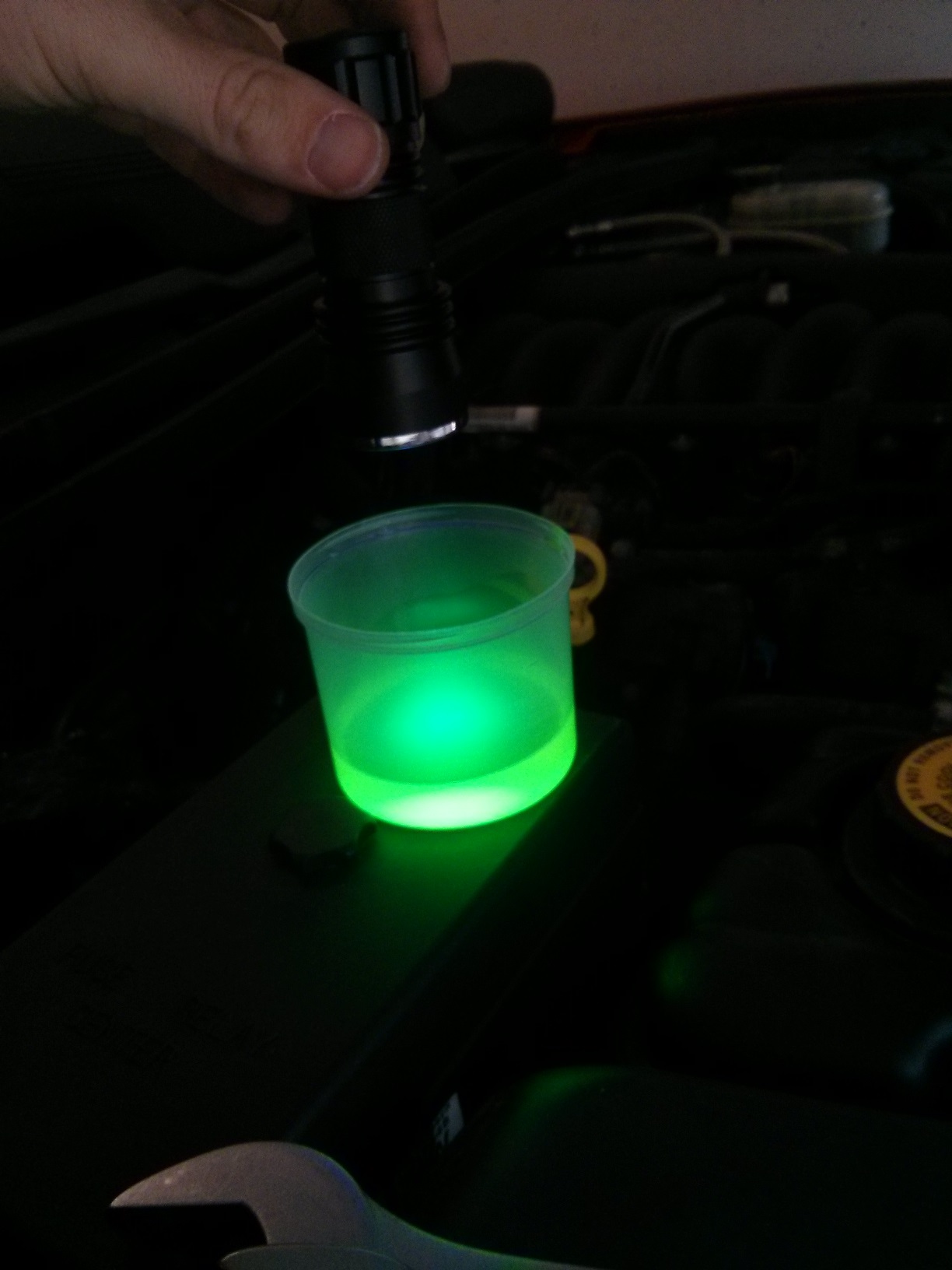 Diese Menge +60ml kommt in den neuen Trockner. Natürlich frisches PAG 46 - Öl mit UV-Zusatz. Falls mal wieder was undicht wird, findet man die Stelle mit ner UV-Lampe: