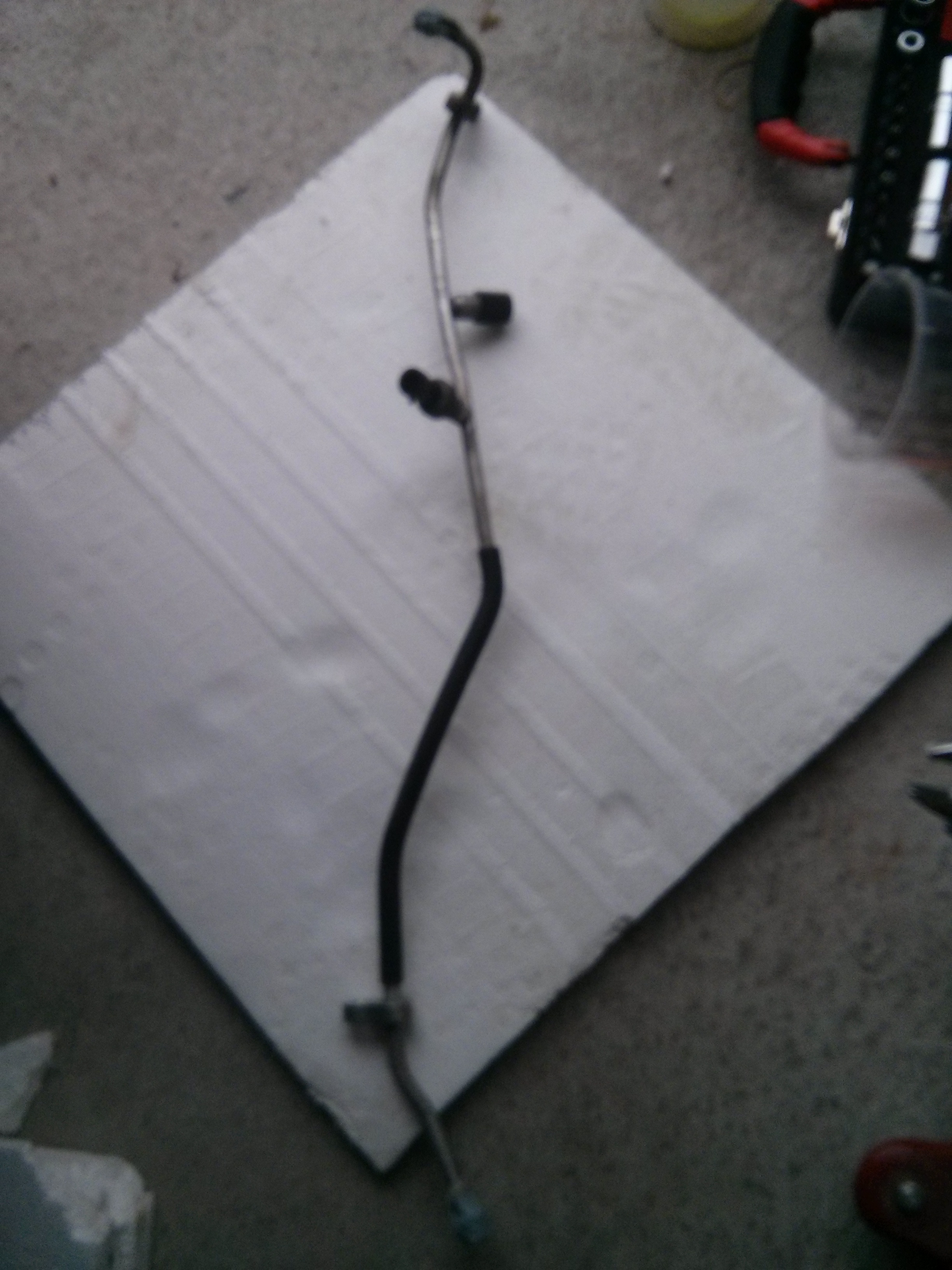 Die erste Leitung vom Trockner zum Kompressor mit ner 13er Nuss lösen und auseinander ziehen. Nicht erschrecken, ist Unterdruck drauf, weil die Anlage abgesaugt wurde. Wenn nicht, ist Überdruck drauf und das Kühlmittel strömt aus. Nicht einatmen.