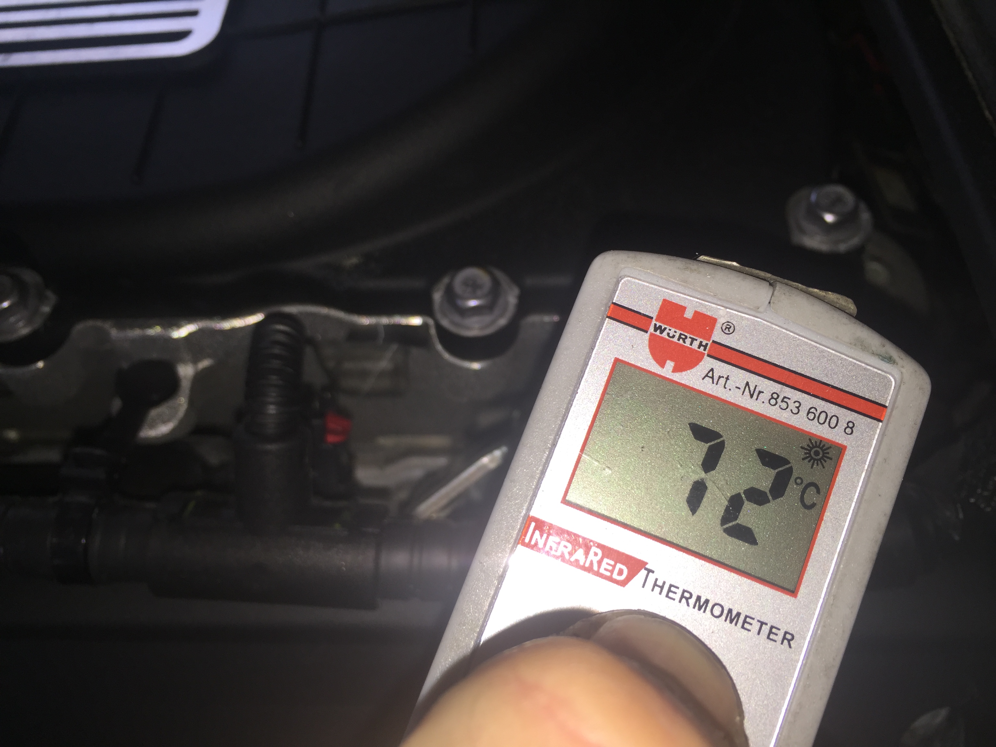 Ich hab es noch mal versucht. Eine C7 Z06 vor der Tür laufen lassen ca. 20min lang (ich musste eine Bremse einbremsen und wollte nicht mit einem kalten Motor rummachen) nach 20 min. habe ich mit dem Thermostat gemessen, am Saugrohr ca. 60C° man kann es aber noch gut anfassen (vermutlich weil sich Kunststoff anders anfühlt als Metall?) Am Kompressor je nach Messpunkt von 55- 70C°