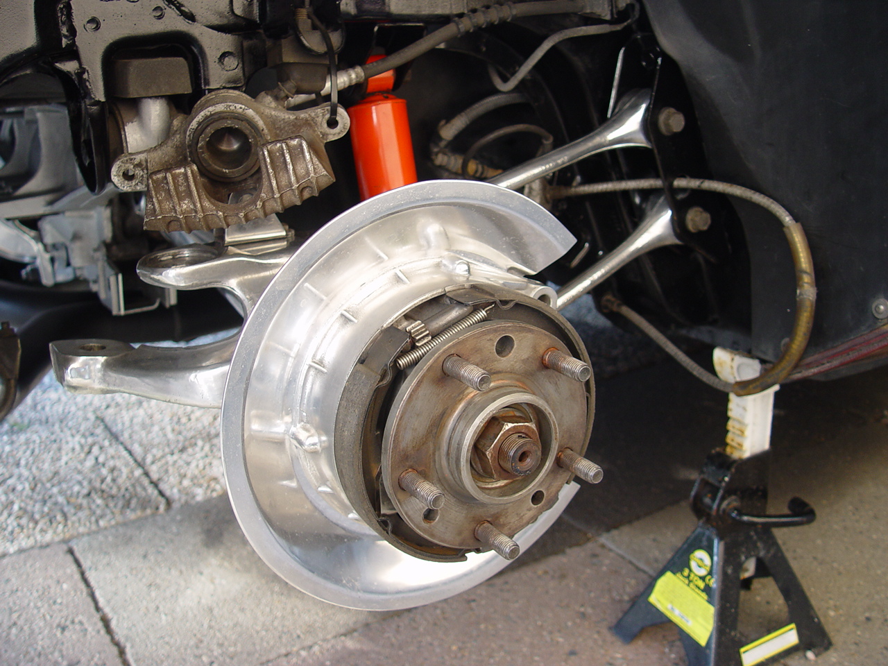 Die Teile wieder unter die Lady zu schrauben ist ab und zu ziemlich schwierig. Die Antriebswellen und die Achschenkelgelenke sind Sauschwer wenn man sie mit einer Hand hochhalten und mit der andere Hand die Bolzen reinschieben muss!! Da muss ein Kerlchen von nur 59 kilo sich ziemlich bemühen um alles hoch zu halten. Aber letztendlich kommt alles wieder gut. Hier unten die linke Seite.