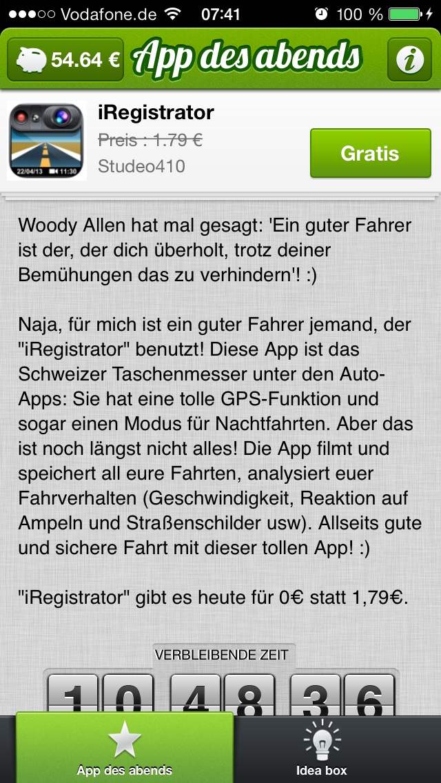 Eine App zum aufzeichnen der Fahrten. Nur noch gute 10 Stunden gratis im App Store!