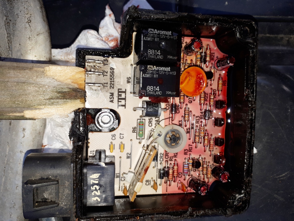 Das Wasser war zwischen der Platinenunterseite und dem schwarzen Kunststoffdeckel. ( da wo das Holz steckt)