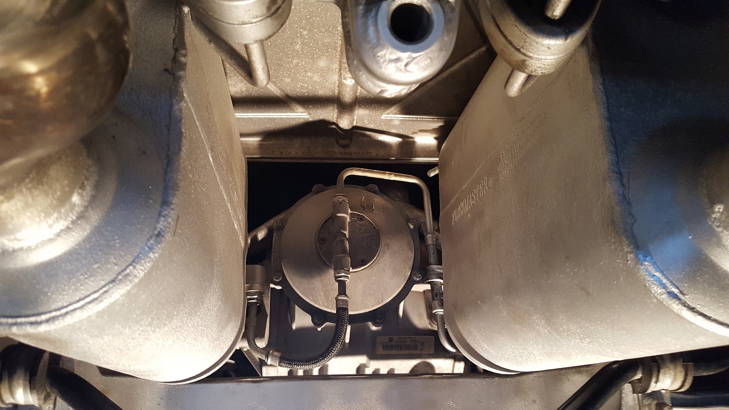 Ich hatte eine Kfz - Grube zur Verfügung. Zuerst habe ich mich von dem rechtsseitigem Endtopf befreit, damit hatte ich mir Platz zum Arbeiten verschafft. Da es ein alter Flowmaster Endtopf war, brauchte ich nur 15er Schlüssel um die Schelle zu lösen, bzw. die Haltegummis abzuziehen - ging in 2 Minuten zu entfernen, wer originale oder andere ESD hat, sollte sich das vorher anschauen.
