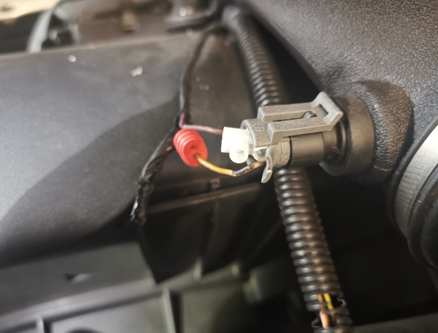 Jetzt habe ich mir eine Lüsteklemme mit dem Cuttermesser zurecht geschnitten, so dass die in den Stecker passt und habe den Stecker an der Seite aufgeschnitten (ich brauche ja sowieso einen neuen) und habe das verbunden um zu testen, ob das Problem damit behoben ist. Hat wunderbar funktioniert, habe keine Fehler mehr im PCM.