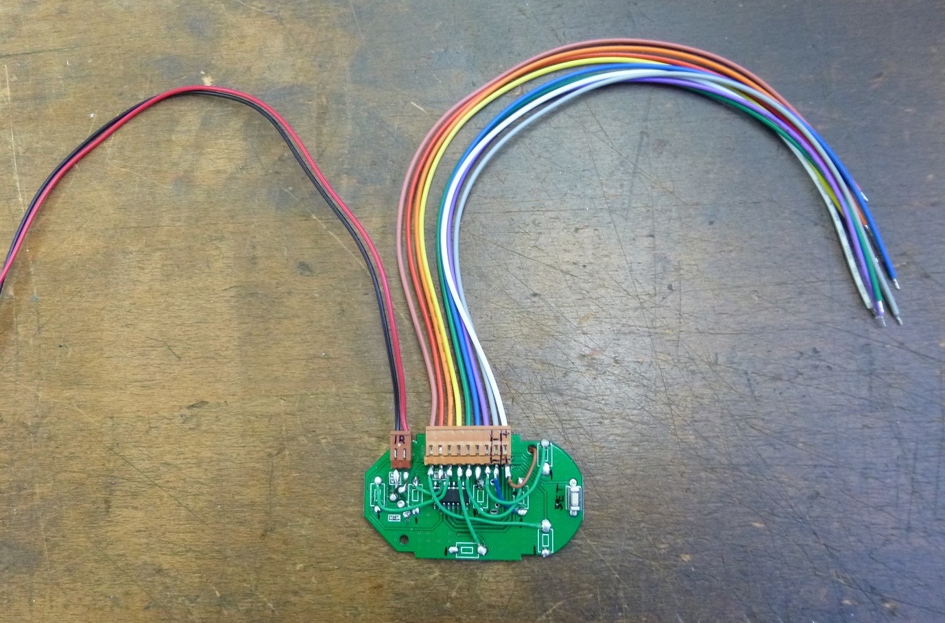 Als erstes hab ich die Platine der Mini-Fernbedienung ausgebaut, die Tasten sowie die IR-Diode entfernt und dafür eine Steckverbindung angelötet.