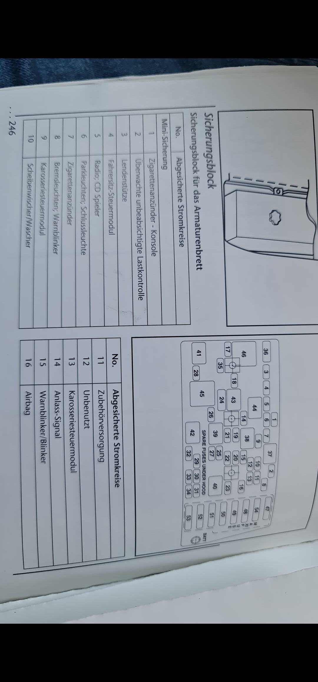 Laut Handbuch soll der Sicherungskasten im Fußraum der Beifahrerseite sein. Ich seh da aber absolut nichts außer durchgehenden Teppich. Ist die Nr. 34.