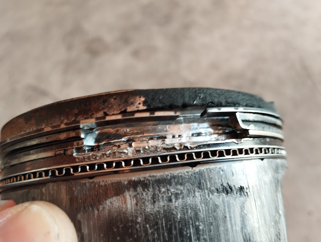 Der Kolbensteg zwischen den Ringen ist gebrochen und über den Ringen ist der Kolben geschmolzen.